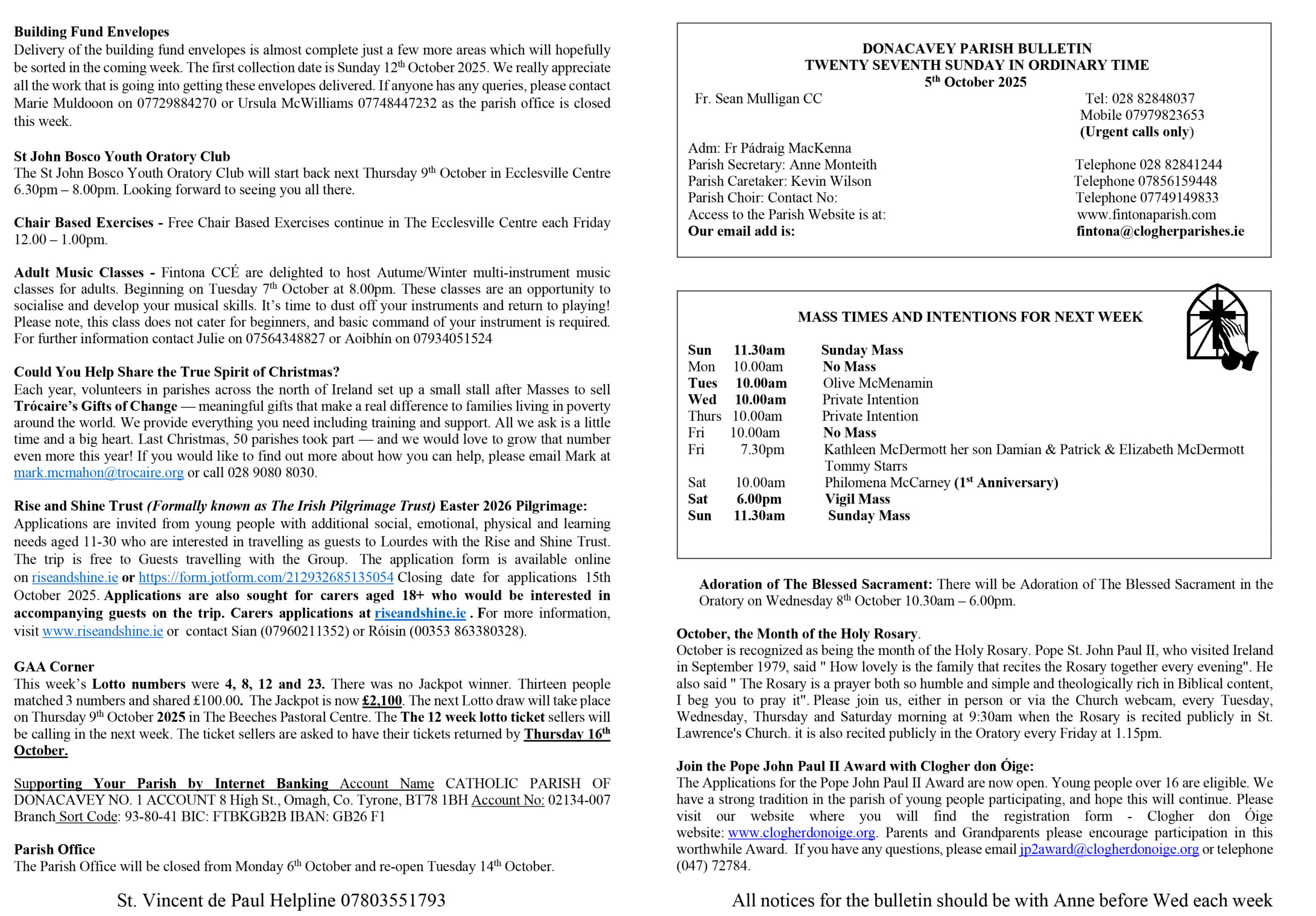 Latest Bulletin TWENTY SEVENTH SUNDAY IN ORDINARY TIME 5th October 2025 ALL MASSES CURRENTLY AVAILABLE ONLINE VIA WEBCAM CLICK ON BULLETIN ABOVE TO ENLARGE